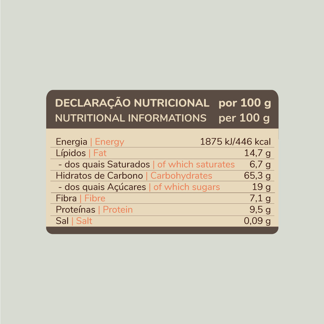 Contém cereais integrais e frutos secos que ajudam a prolongar a saciedade.