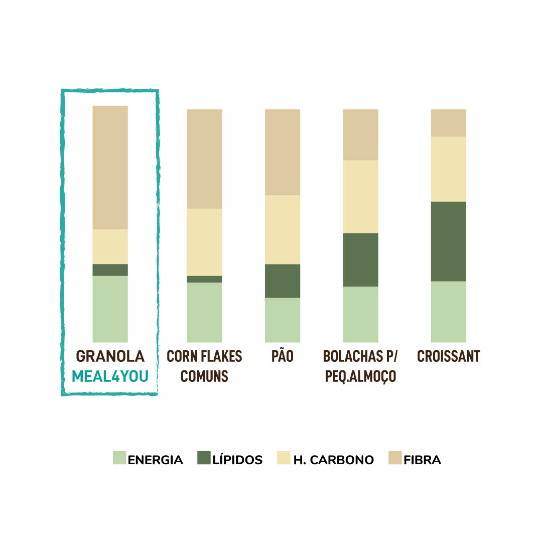 Comparada com outras opções comuns, a Granola Meal4You possui um alto teor em fibra, o que te permite enfrentar o dia com mais energia.